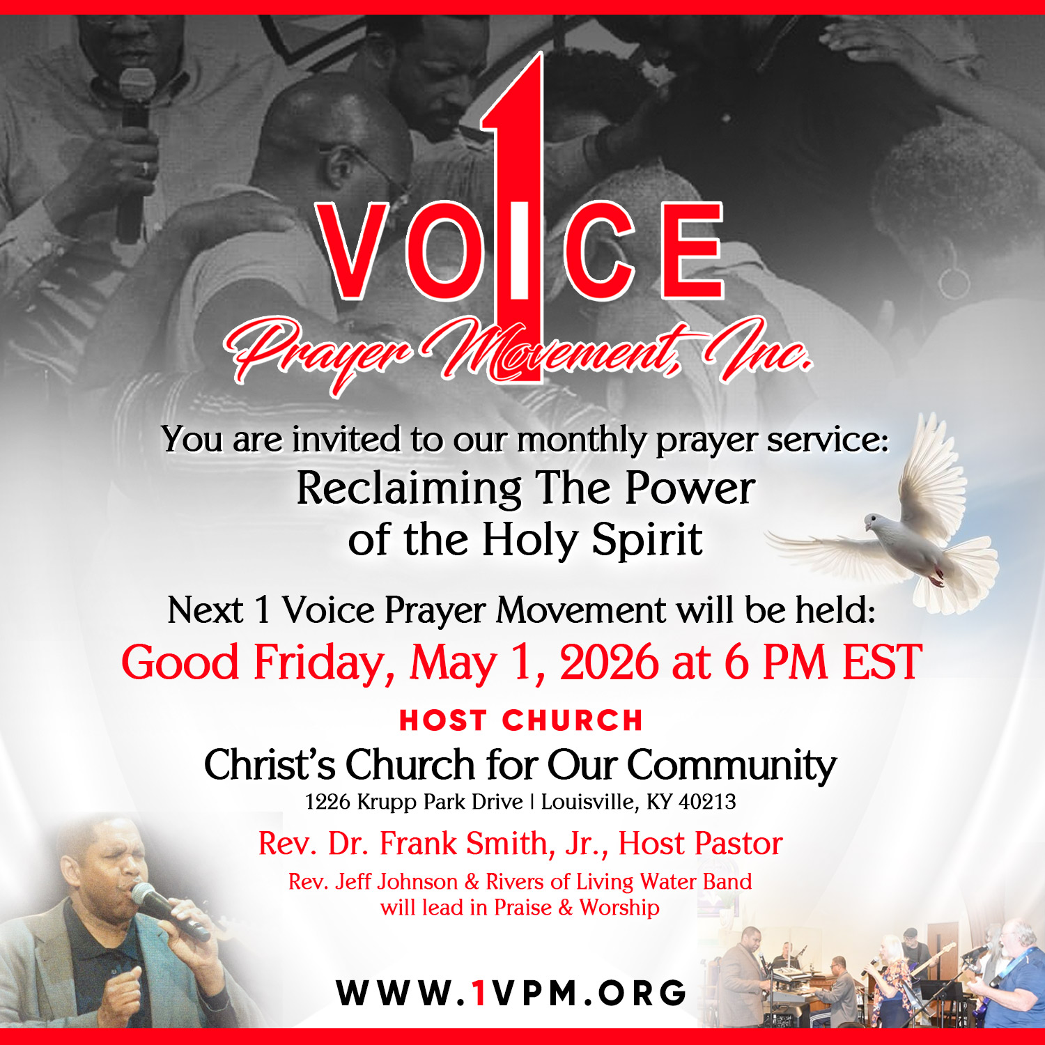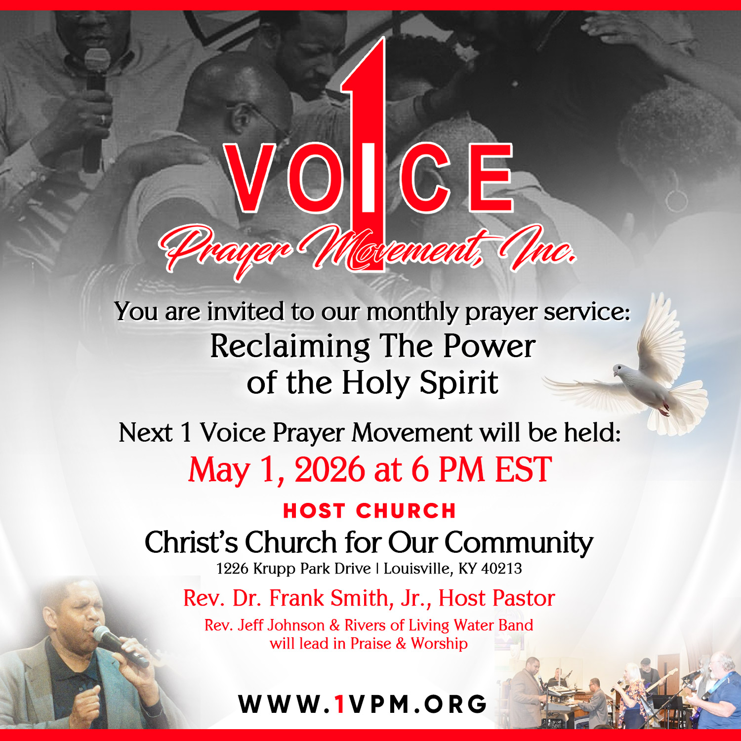 1 Voice Prayer Movement, Inc. (1VPM) began as a prayer ministry which was founded and led by Cheri L. Mills in 2009. As a prayer ministry, 1VPM, Inc. met at a different host church in Louisville, KY each month to pray for the city, state, nation, and world.